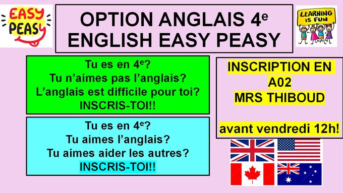 Option anglais 4e - période 2 - inscriptions jusqu'à vendredi 17/10!